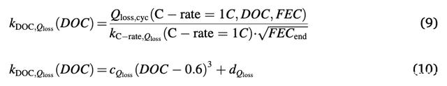 放電深度對于鋰離子電池的循環(huán)性能具有顯著的影響,從前面的數(shù)據(jù)來看當放電深度低于80%時電池會出現(xiàn)多種不同的衰降形式,因此作者在這里也僅對80%和100%DOD放電深度的電池進行了模擬。其中KDOC Qloss可以通過對下式9進行擬合獲得,然后根據(jù)下式10轉(zhuǎn)換為與放電深度之間的關(guān)系。