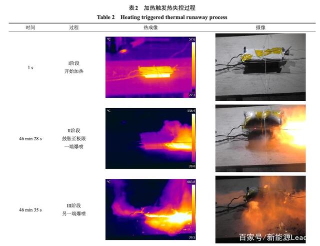 為了觀測上述的軟包電池在熱失控過程中的行為,作者設(shè)計了下圖所示的觀測系統(tǒng),采用高速相機(4000幀/s)、熱成像相機和普通相機記錄了整個熱失控過程。實驗中作者采用了兩種方式觸發(fā)熱失控,第一種是加熱的方式,通過在電池下部增加一個熱板,對滿電態(tài)的電池進行加熱,觸發(fā)熱失控。第二種方式是采用充放電設(shè)備對電池進行持續(xù)充電,通過過充的方式觸發(fā)電池?zé)崾Э亍?/div>