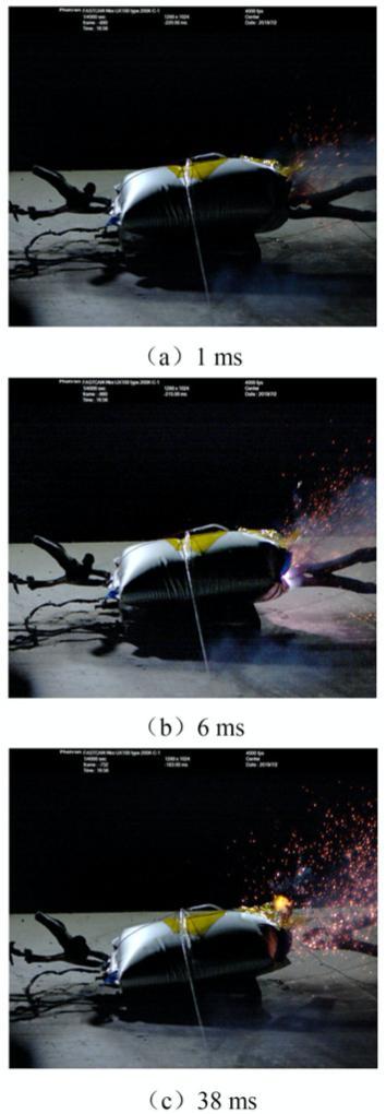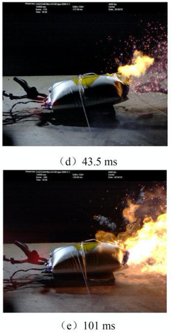 下圖為作者采用高速相機記錄的電池?zé)崾Э厮查g的畫面,可以看到電池時從靠近極耳的位置發(fā)生破裂,同時電池爆噴的速度非?欤诓坏0.5s的時間里就有大量的火焰從鋁塑膜的破口出噴出。