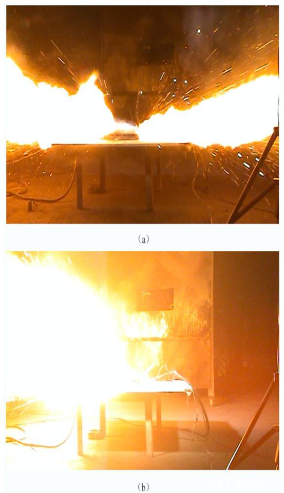 在過充引發(fā)的電池爆噴中,電池噴出的電解液在初期并沒有發(fā)生燃燒,當(dāng)這些可燃的氣體和液體與空氣中的氧氣達到一定的濃度時,電池噴出車的熔融顆粒會突然將其引燃,引起爆炸式燃燒(如下圖所示)。