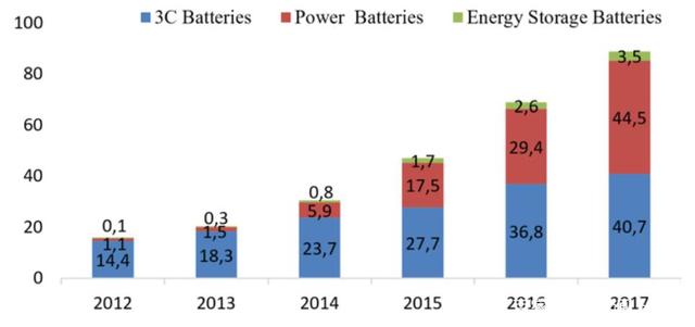 目前全球動(dòng)力電池市場(chǎng)基本形成了中、日、韓三足鼎立的格局,其中中國(guó)是全球最具活力的動(dòng)力電池市場(chǎng),2017年中國(guó)市場(chǎng)動(dòng)力電池產(chǎn)量達(dá)到了88.7GWh,年化增長(zhǎng)率達(dá)到了29.3%,其中動(dòng)力電池為44.5GWh,超越了傳統(tǒng)的3C消費(fèi)電子,成為鋰離子電池市場(chǎng)的主力。