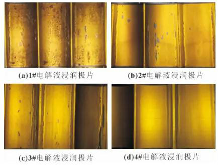從圖中可以看出,四種電解液相比,方案1條件下的極片出現(xiàn)大量的黑斑,有明顯的死區(qū)和析鋰狀況。方案2相比于方案1析鋰狀況有所緩解,但仍存在少量的死區(qū)。方案3的極片不存在析鋰狀況,且僅有少量死區(qū)斑點(diǎn)存在。而方案4的極片狀態(tài)良好,極片光滑、平展,沒有死區(qū)及析鋰狀況。與表3中的電解液方案相結(jié)合可以看出,當(dāng)EC質(zhì)量分?jǐn)?shù)為40%時(shí),極片出現(xiàn)明顯的異常狀況,EC質(zhì)量分?jǐn)?shù)下降至35%,負(fù)極表面狀態(tài)即有明顯好轉(zhuǎn),EC質(zhì)量分?jǐn)?shù)降至30%后,極片表面進(jìn)一步改善。在方案3的基礎(chǔ)上去掉粘度較高的PC后,極片狀態(tài)非常理想。