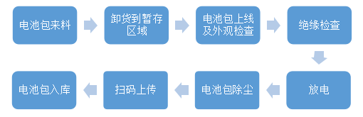 1)電池包到廠;2)卸貨到中轉(zhuǎn)區(qū)域;3)外觀檢查;4)絕緣檢測;5)放電(外觀檢測不合格品放電后直接手工拆解);6)掃碼上傳;7)入庫。