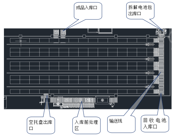 智能化立體倉庫用來集中存放回收回來的電池包,同時根據(jù)生產(chǎn)需要從智能化立體倉庫中轉(zhuǎn)運到拆解生產(chǎn)線上進行拆解,智能化立體倉庫中主要設(shè)備包含:高層貨架、堆垛機、運輸機、托盤、AGV小車、天軌、地軌、計算機硬件、WMS系統(tǒng)、WCS系統(tǒng)等。
