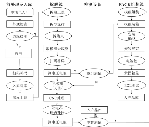 研究回收的鋰電池包從入庫到報廢整個過程的智能化生產(chǎn)線裝備,首先入庫,拆機電池包,再到梯次利用或者再生利用,內(nèi)容及路線如下: