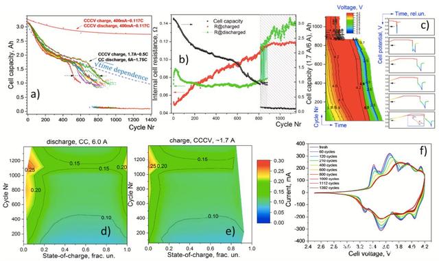 作者利用在放電開始和結(jié)束時電流變化對電池電壓造成的變化計算了電池在0%SoC和100%SOC下的電池內(nèi)阻,下圖b為電池在0%和100%SoC狀態(tài)下的內(nèi)阻隨循環(huán)次數(shù)的變化曲線,我們可以注意到滿電態(tài)的電池的內(nèi)阻在810-850次時快速增加,這主要是因為電池這時極化非常大,在放電的初期電池電壓就從4.2V下降到了2.5V。