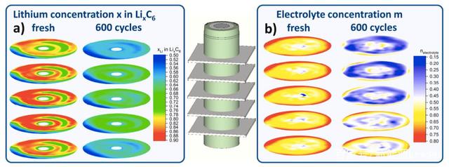 下圖a為新電池和循環(huán)后的18650電池內(nèi)部負極中Li濃度的分布,可以看到循環(huán)后的電池Li濃度要顯著低于新鮮電池,這主要是由于循環(huán)過程中界面的副反應消耗了較多的活性Li。同時在電池的高度方向上還存在顯著的Li濃度不均勻的現(xiàn)象,電池的上部和下部的Li濃度較低,這種差距可能是由于電池在工作過程中壓力、溫度不均,以及電解液浸潤不均和氣體堆積等因素造成的。