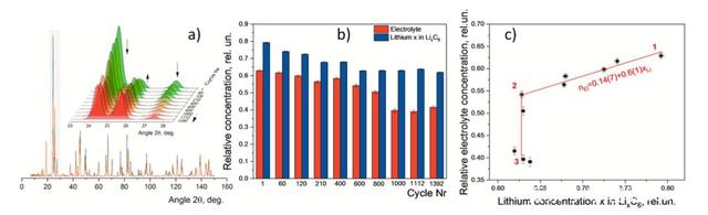 循環(huán)后的鋰離子電池內(nèi)部這種非均勻的Li和電解液分布表明鋰離子電池循環(huán)過程中的衰降存在較為復雜的機理。為了分析電解液和鋰損失之間的關系,作者對不同循環(huán)次數(shù)的電池進行了分析,從下圖a的插入圖中能夠看到(001)/(002) LiC6/LiC12的比值隨著循環(huán)次數(shù)的增加而持續(xù)降低,這表明石墨負極中的鋰含量持續(xù)降低,同時反應電解液的(002)峰的強度也出現(xiàn)了降低。根據(jù)上述的衍射數(shù)據(jù)了作者計算了電池內(nèi)電解液和Li含量圖(如下圖b所示),從圖中能夠看到隨著循環(huán)次數(shù)的增加,電解液和活性Li的含量也都出現(xiàn)了明顯的降低,但是衰降過程明顯的分為兩個過程。下圖c中作者制作了活性Li與電解液相對值的關系圖,從圖中能夠更加明顯的看到兩個區(qū)域,在1-2的區(qū)域內(nèi)Li損失和電解液的損失是呈現(xiàn)線性的,但是在600次循環(huán)后,負極中的活性Li損失基本停止,但是電解液開始大量分解。