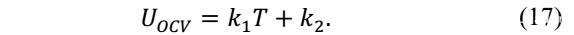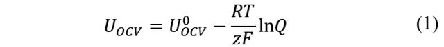 電池的電壓主要反應(yīng)電池儲(chǔ)存的能量,受到溫度的影響,根據(jù)能斯特方程電池的開路電壓與溫度的關(guān)系如下式所示,其中R為氣體常數(shù),T為絕對(duì)溫度,z電化學(xué)反應(yīng)交換的電子數(shù),F(xiàn)為法拉第常數(shù),Q為反應(yīng)物的比例(在這里作者認(rèn)為電池內(nèi)部的反應(yīng)物的濃度變化可以忽略,因此Q為定值),值得注意的是下式中的參數(shù)都與溫度無關(guān),但是與電池的SoC狀態(tài)密切相關(guān)。