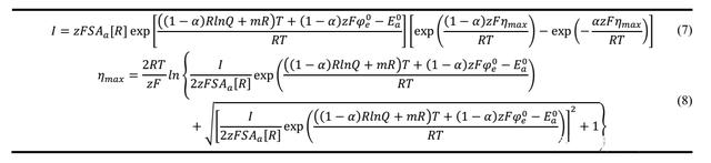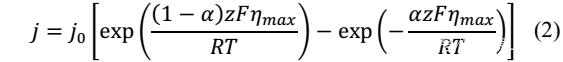 BV公式是最重要的電化學(xué)動(dòng)力學(xué)公式,主要描述了電流密度與穩(wěn)態(tài)過電勢(shì)之間的關(guān)系(如下式所示),其中j為電流密度,j0為交換電流密度,α為對(duì)稱系數(shù),ηmax為穩(wěn)態(tài)電化學(xué)過電勢(shì)。