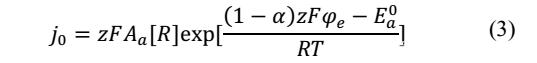 上述公式僅能夠在固定的溫度下使用,因?yàn)榻粨Q電流密度j0與溫度之間存在密切的關(guān)系,根據(jù)交換電流密度的定義,作者給出了如下所示的交換電流密度的定義公式,其中Aa為常數(shù)項(xiàng),[R]表征反應(yīng)物的濃度,φe表征電極的電勢(shì),Ea0則表征反應(yīng)的活化能,