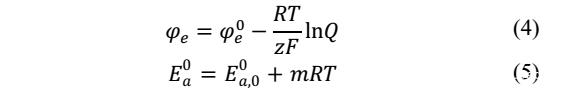 根據(jù)Nernst公式,φe可以采用下式4進(jìn)行表征,Ea0則可以通過下式5表征為溫度的函數(shù),m為一個(gè)無關(guān)溫度的常數(shù)。