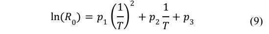 電池歐姆阻抗基本不受電池電流的影響,但是卻受到溫度的顯著影響,但是研究表明歐姆阻抗R0受溫度影響的規(guī)律并不符合阿倫尼烏斯公式,因此作者在這里采用了一個(gè)多項(xiàng)式描述歐姆阻抗受到溫度的影響(如下式所示),其中P1、P2和P3分別多項(xiàng)式的系數(shù)