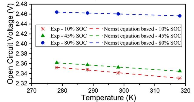 在下圖中作者分別根據(jù)Nernst方程計(jì)算了電池在10%、45%和80%SoC狀態(tài)下電池的開路電壓與溫度之間的關(guān)系,可以看到計(jì)算結(jié)果與實(shí)際結(jié)果符合的非常好。