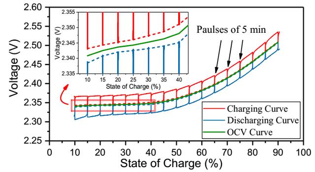 等效電路模型的首先要做的工作就是確定電池的開路電壓,下圖中展示了快速測(cè)量鈦酸鋰電池開路電壓的方法,電池以1C倍率進(jìn)行充放電,每5%SoC電池靜置5min,然后根據(jù)充電和放電電壓作者得到了下圖中綠線所示的開路電壓曲線。