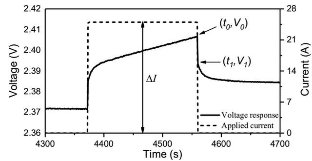 下圖為電池在放電過程中靜置期間的電壓變化,我們可以根據(jù)電流變化瞬間引起的壓降計(jì)算電池的歐姆阻抗(如下式所示),這里兩次取樣時(shí)間的間隔設(shè)定為1s,這主要是因?yàn)殡姵氐臉O化通常需要數(shù)十秒,甚至是數(shù)百秒的時(shí)間達(dá)到平衡,因此在1s的時(shí)間內(nèi)電池的極化不會(huì)發(fā)生顯著的變化,因此此時(shí)的電壓變化主要來自于電池的歐姆阻抗。