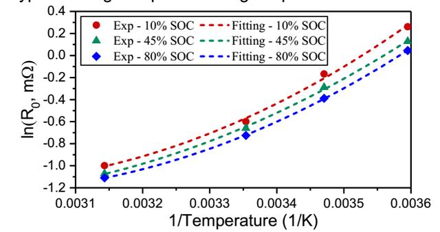下圖為作者根據(jù)阿倫尼烏斯公式繪制的在特定的SoC狀態(tài)下電池的歐姆阻抗與溫度之間的關(guān)系,從圖中能夠看到兩者呈現(xiàn)非線性的關(guān)系,這表明歐姆阻抗與溫度之間并不遵循阿倫尼烏斯公式,因此作者在這里采用一個(gè)多項(xiàng)式對(duì)電池的歐姆阻抗與溫度之間的關(guān)系進(jìn)行了描述,從同種能夠看到擬合結(jié)果與實(shí)測(cè)結(jié)果之間符合的非常好。