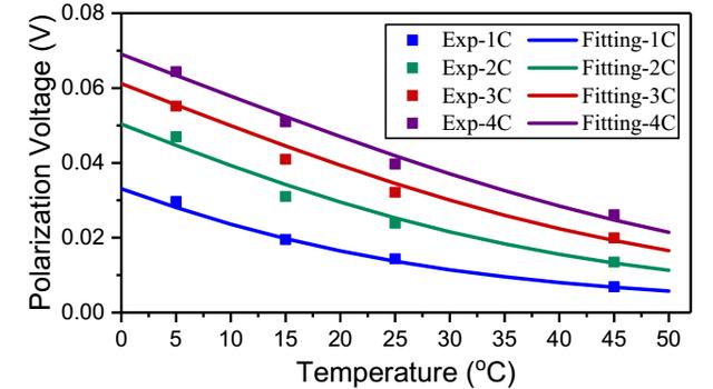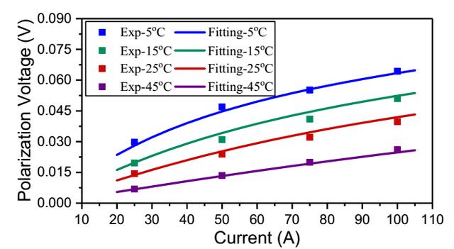 在上面我們已經(jīng)獲得了電池的開路電壓和歐姆阻抗R0,因此我們可以根據(jù)上式16來計(jì)算電池的穩(wěn)態(tài)極化電壓,在這里作者采用了恒流充電過程中的數(shù)據(jù),以確保電池的極化達(dá)到穩(wěn)態(tài)。下圖分別為電池在不同的溫度下以不同的電流進(jìn)行充放電的極化電壓數(shù)據(jù),從圖中能夠看到溫度和電流對(duì)于電池開路電壓的影響是呈現(xiàn)非線性的關(guān)系,作者在這里采用修正的BV公式獲得了擬合結(jié)果,從圖中能夠看到仿真結(jié)果與實(shí)測(cè)結(jié)果最大誤差約為2.2mV。