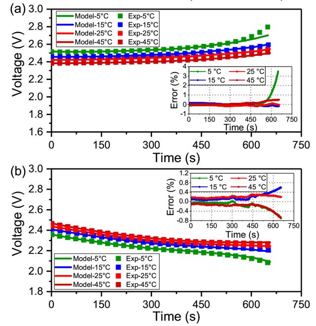 為了進(jìn)一步驗(yàn)證模型的有效性,作者采用在不同溫度下4C恒流充放電的形式對(duì)電池進(jìn)行了測(cè)試,從下圖a的充電工況模擬結(jié)果可以看到,在前516s中擬合誤差在0.2%以內(nèi),在516s后誤差也控制在-0.2%至0.5%之間,僅在5℃下誤差增長(zhǎng)較快達(dá)到3.5%,這主要是受到低溫下電池較低的傳質(zhì)速率的影響,因此濃差極化的影響不能再被忽略,導(dǎo)致誤差升高。
