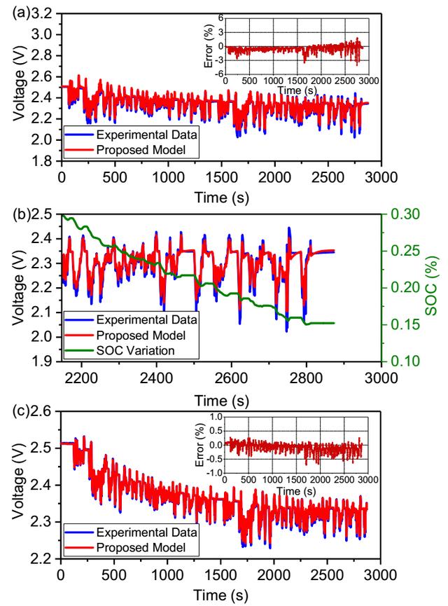 接下來作者采用更為復(fù)雜的FUDS制度對(duì)模型的準(zhǔn)確性進(jìn)行了檢驗(yàn),電池的最大電流可以達(dá)到8C左右,從下圖a中可以看到即便是在如此復(fù)雜的使用工況中,模型對(duì)于電壓預(yù)測(cè)的最大誤差也僅為-4%與1.7%之間,從下圖c中可以看到在35℃的條件下模型能夠獲得更好的預(yù)測(cè)精度,誤差僅為-0.7%至0.3%之間,這主要是因?yàn)楦邷叵铝己玫膫髻|(zhì)速率,消除了濃差極化造成的影響。