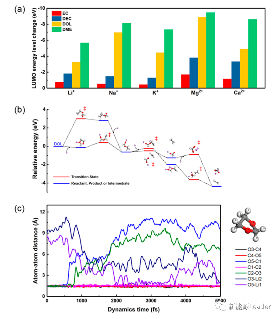 當(dāng)分子與陽離子結(jié)合后,陽離子會吸引分子中的電子,從而使得分子的LUMO能量進一步降低,因此在陽離子溶劑化外殼結(jié)構(gòu)中的分子更容易在負(fù)極表面的電子,發(fā)生還原分解反應(yīng),這也導(dǎo)致了電解液相對于純?nèi)軇└菀装l(fā)生還原分解。除了對分子的熱力學(xué)分析以外,人們也利用分子動力學(xué)工具從動力學(xué)角度進行了分析,以DOL溶劑為例,在與Li+溶劑化以后,其開環(huán)反應(yīng)的能壘從3.0eV降低到了0.56eV,因此在電解液中溶劑會更為容易發(fā)生分解反應(yīng)。