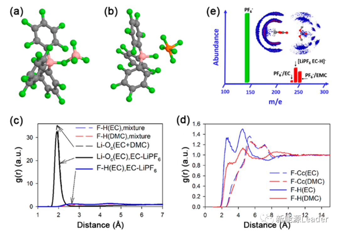 通常我們認(rèn)為具有更多的受體數(shù)或者裸漏正電荷位置的溶劑分子能夠與陰離子形成強的相互作用,例如三(五氟苯基)硼烷(TPFPB)中的B元素作為電子受體,BF4−和PF6−形成較強的相互作用。此外,陰離子也更傾向與環(huán)狀溶劑結(jié)合,因為環(huán)狀溶劑具有更強的極性。但是由于陰離子與溶劑分子之間較弱的作用力,因此我們?nèi)匀缓茈y定義陰離子的溶劑化外殼。但是我們?nèi)匀荒軌驈睦碚撋蠈﹃庪x子溶劑化的影響進行分析 ,首先溶劑分子與陰離子發(fā)生溶劑化之后,氧化穩(wěn)定性降低,還原穩(wěn)定性提高,其次溶劑化后會使得陰離子的遷移速度降低,從而提升電解液的遷移數(shù),有利于鋰離子電池倍率性能的提升。第三是陰離子溶劑化之后,能夠促進鋰鹽的溶解,提升鋰鹽的濃度;最后,在陰離子溶劑化之后,Li+-溶劑化結(jié)構(gòu)會發(fā)生改變,從而對電解液的結(jié)構(gòu)和界面反應(yīng)產(chǎn)生影響。