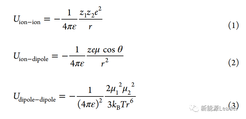 分子間的作用力主要包括離子-離子、離子-偶極子和偶極子-偶極子三種形式,在經(jīng)典物理模型中,這三種力的電勢如下所示。其中ε為介電常數(shù),ze為離子的電荷數(shù),μ為偶極子的偶極矩,r為離子間距或偶極子的中心距,θ為偶極矩傾角,kB為Boltzmann常數(shù),T為絕對溫度。