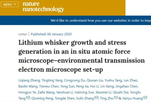 鋰金屬被認(rèn)為是未來可充電電池的最終負(fù)極材料,但由于鋰枝晶的不可控生長,鋰金屬電池的發(fā)展受到了嚴(yán)重制約。于是人們寄希望于固態(tài)電解質(zhì),希望用機械剛性固態(tài)電解質(zhì)這座“大山”來壓制鋰枝晶生長。然而,現(xiàn)實是殘酷的,多位研究者發(fā)現(xiàn)鋰枝晶仍然能在固態(tài)電解質(zhì)中生長。解決這個問題需要對鋰枝晶的生長和相關(guān)的電化學(xué)力學(xué)行為有一個基本的理解。作者將原子力顯微鏡與環(huán)境透射電子顯微鏡(AFM–ETEM)進行巧妙結(jié)合,實現(xiàn)了觀察鋰晶須原位生長的同時,對其進行了應(yīng)力測量。