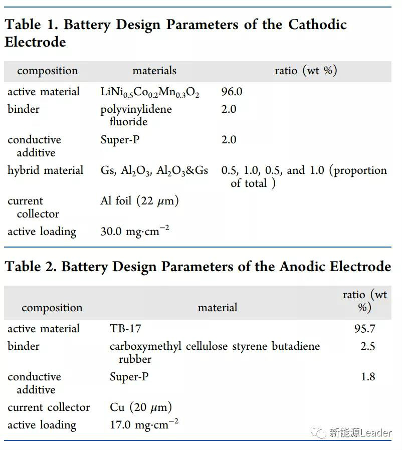 實(shí)驗(yàn)中采用的正負(fù)極配方如下表所示,正極活性物質(zhì)未NCM523材料,活性物質(zhì)涂布量為30mg/cm2,負(fù)極為石墨,涂布量為17mg/cm2,N/P比為1.1。上述電極制成規(guī)格為303450的軟包電池,電解液為1MLiPF6,溶劑配方為EC:EMC:DMC=1:1:1。
