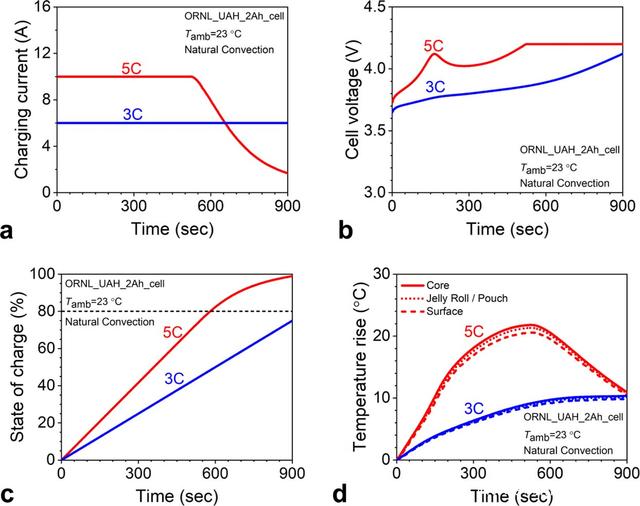隨后作者考察了冷卻方式對電池溫升和溫度梯度的影響。下圖為在自然對流下,以3C和5C充電時電池的電化學和熱行為,包括電流、電壓、SOC和溫度曲線。在自然對流下,5C充電時的最大電池表面溫升達到20.6℃,比強制對流冷卻下5C充電時的最大溫升要高(僅為13℃),甚至高于強制對流時7C充電的最大溫升。這種對比結(jié)果表明采用類似強制對流的冷卻方式能控制超級快充時鋰離子電池的溫升。此外,強制對流冷卻的溫度梯度也大于自然對流情況,這是因為強制對流會導致更快的熱消散。