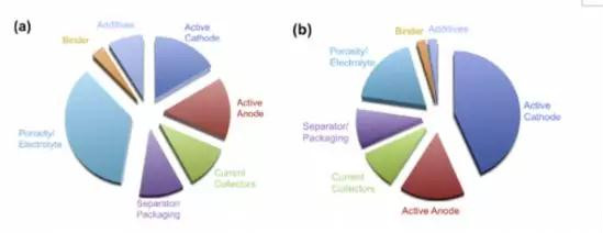 (現(xiàn)在鋰離子電池各組分的(a)體積占比和(b)質(zhì)量占比)