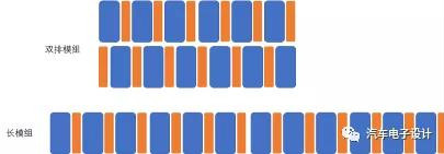 1)如果是同一個(gè)電池容量的鐵鋰和三元電芯,鐵鋰會(huì)明顯的比三元要厚,造成的就是厚-薄-厚-薄-厚的排列。在直接設(shè)計(jì)中,不管是雙排模組還是長(zhǎng)模組,會(huì)出現(xiàn)以下的設(shè)計(jì)狀態(tài)。直觀的概念,就是CCS母線排的設(shè)計(jì)會(huì)有難度,模組在制造過程中有難度,整體的膨脹力控制有難度。當(dāng)然你下定決心,這些在工藝層面都是可以做的。