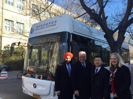 訪華團成員與福田歐輝12米氫燃料電池客車合影