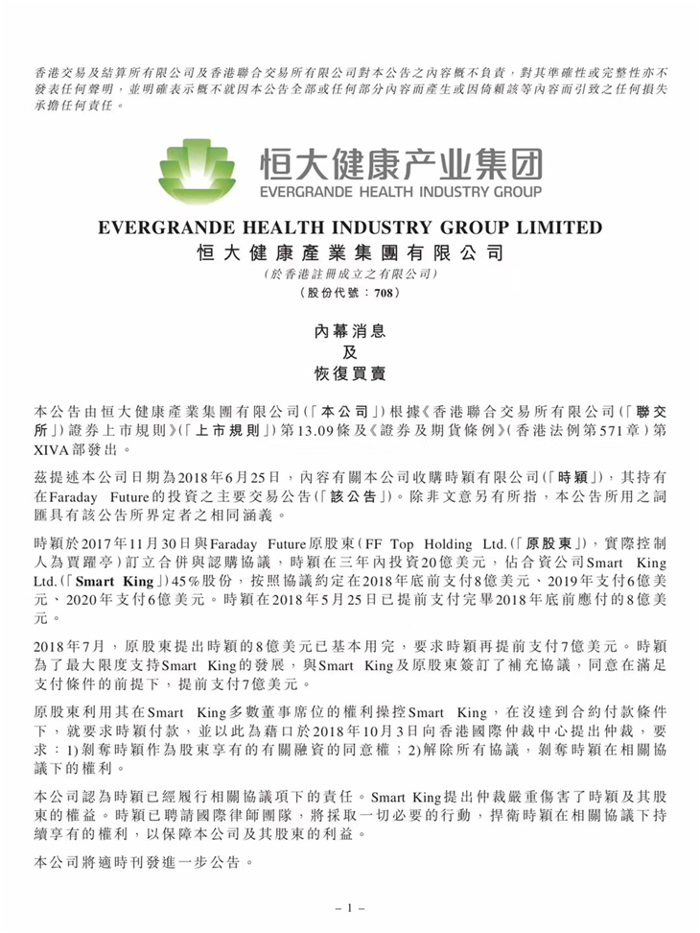 公告顯示,2018年7月,賈躍亭提出恒大的8億美元已基本用完,要求恒大再提前支付7億美元。恒大為了最大限度支持合資公司的發(fā)展,與賈躍亭簽訂了補充協(xié)議,同意在滿足支付條件的情況下,提前支付7億美元。賈躍亭利用其在合資公司多數(shù)董事席位的權(quán)力操控合資公司,在沒達到合約付款條件下,就要求恒大付款,并以此為借口于2018年10月3日在香港仲裁中心提出仲裁,要求剝奪恒大作為股東享有的有關(guān)融資的同意權(quán),并解除所有協(xié)議。