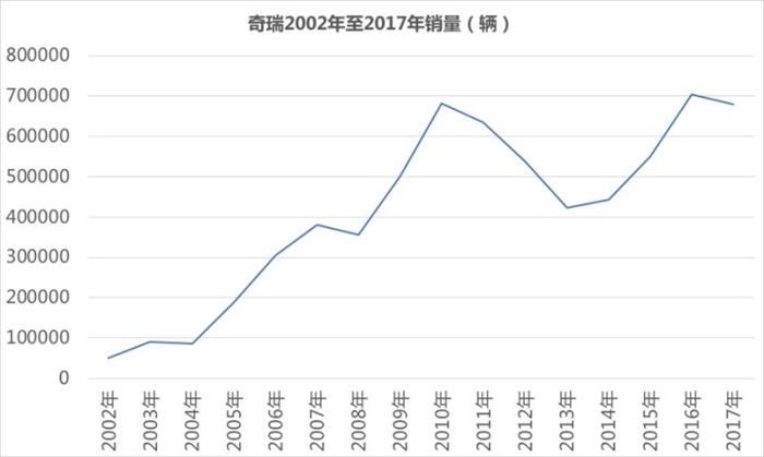 變賣資產(chǎn)的背后是奇瑞汽車銷量業(yè)績的重壓。經(jīng)過多年的銷量爬坡,奇瑞汽車曾在2010年達(dá)到一個銷量高峰,年銷量達(dá)68.2萬輛,此后三年奇瑞汽車銷量連續(xù)走低。2013年-2016年,奇瑞汽車經(jīng)過調(diào)整后,再次登上銷量高峰,超過2010年達(dá)到70.5萬輛。