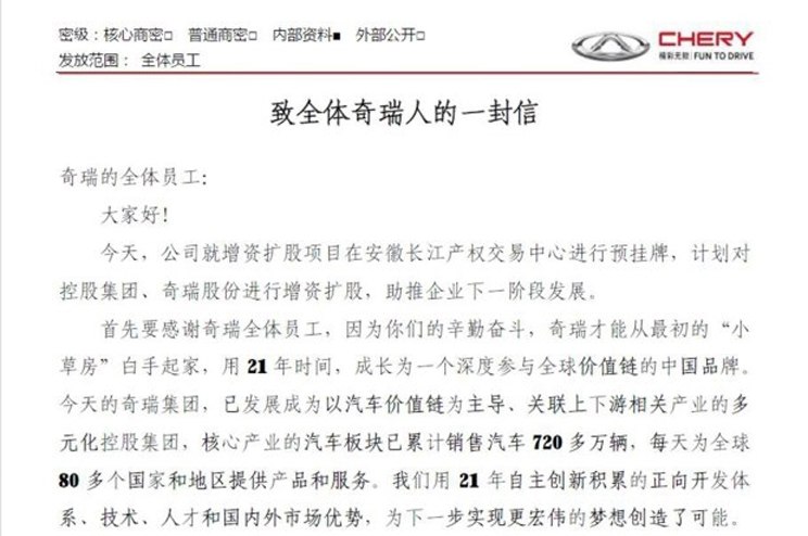 奇瑞控股集團(tuán)有限公司董事長、奇瑞汽車股份有限公司董事長尹同躍在《致全體奇瑞人的一封信》中表達(dá)了關(guān)于增資擴(kuò)股的初衷,一方面是基于奇瑞制定的“奇瑞2025戰(zhàn)略”規(guī)劃,在新產(chǎn)品、新技術(shù)、新能源、智能互聯(lián)+無人駕駛、品牌建設(shè)、高端國際市場等方面進(jìn)行了一系列布局,規(guī)劃落地需要巨大的資金投入,需要引入戰(zhàn)略資本,另一方面是響應(yīng)中央“去杠桿”號召,希望通過增資擴(kuò)股降低企業(yè)成本,讓國有資產(chǎn)保值增值,推動企業(yè)做大做強。