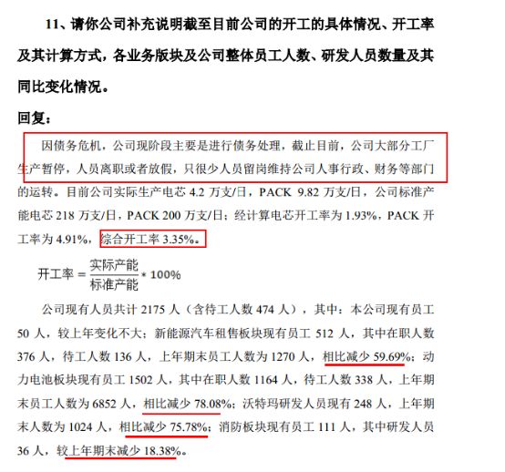 員工人數(shù)更是劇烈下降,例如動力電池板塊上年末6852人,目前僅1502人,下降78.08%;沃特瑪研發(fā)人員現(xiàn)有248人,上年期末人數(shù)為1024人,相比減少75.78%。
