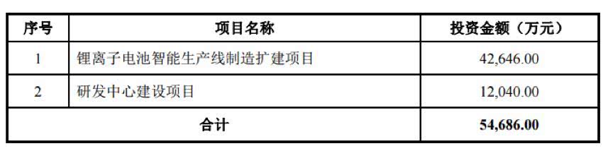 公司申請(qǐng)上市擬募集資金5.47億元,將投資于投資于鋰離子電池智能生產(chǎn)線制造擴(kuò)建項(xiàng)目及研發(fā)中心建設(shè)項(xiàng)目。