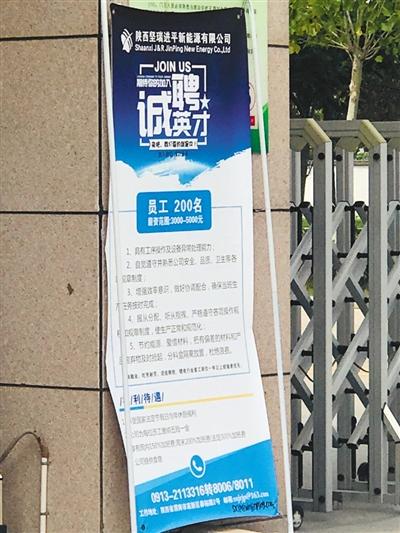 記者注意到,在工廠大門的兩旁,分別豎立著兩個(gè)告示欄,上方貼著“陜西堅(jiān)瑞進(jìn)平新能源有限公司”的藍(lán)色字樣。工廠內(nèi)大樓的頂上也豎立著“陜西進(jìn)平”四個(gè)大字。