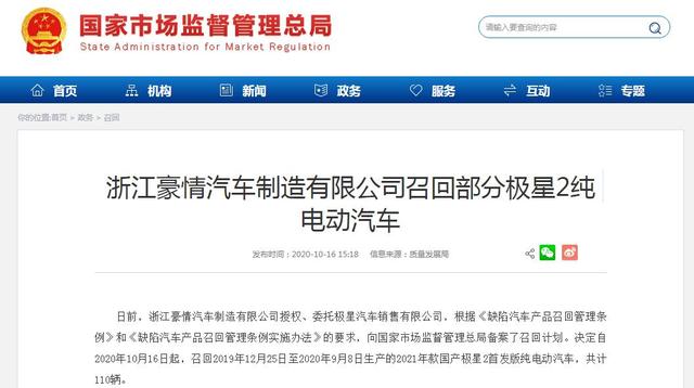 國家市場監(jiān)管局介紹,日前,浙江豪情汽車制造有限公司授權(quán)、委托極星汽車銷售有限公司,根據(jù)《缺陷汽車產(chǎn)品召回管理條例》和《缺陷汽車產(chǎn)品召回管理條例實施辦法》的要求,向國家市場監(jiān)督管理總局備案了召回計劃。決定自2020年10月16日起,召回2019年12月25日至2020年9月8日生產(chǎn)的2021年款國產(chǎn)極星2首發(fā)版純電動汽車,共計110輛。