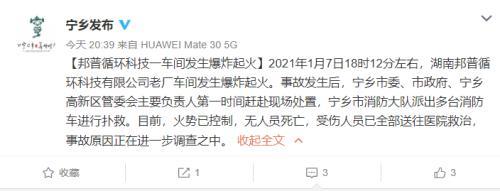 1月7日晚20:39,官方微博“寧鄉(xiāng)發(fā)布”通報,7日18時12分左右,湖南邦普循環(huán)科技有限公司(簡稱“湖南邦普”)老廠車間發(fā)生爆炸起火。
