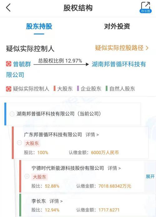 天眼查顯示,湖南邦普是廣東邦普循環(huán)科技有限公司(簡稱“廣東邦普")的全資子公司,寧德時代控股廣東邦普52.88%。