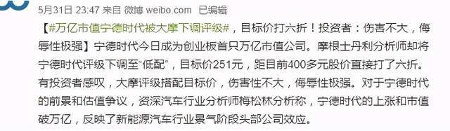 這時(shí)候,摩根士丹利就面臨 " 打臉 " 的尷尬了:5 月 31 日,其將寧德時(shí)代評級下調(diào)至 " 低配 ",目標(biāo)價(jià)為 251 元。當(dāng)時(shí)有網(wǎng)友稱 " 傷害性不大,侮辱性極強(qiáng) "。