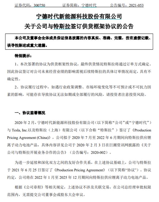 公告稱,協(xié)議的簽訂表示特斯拉對寧德時(shí)代動力電池的產(chǎn)品質(zhì)量和生產(chǎn)能力進(jìn)一步認(rèn)可,有助于強(qiáng)化公司與特斯拉長期穩(wěn)定的合作關(guān)系,符合公司和股東的利益。根據(jù)《公司章程》等相關(guān)規(guī)定,上述協(xié)議不涉及關(guān)聯(lián)交易,在公司總經(jīng)理審批權(quán)限范圍內(nèi),無需提交公司董事會或股東大會審議。