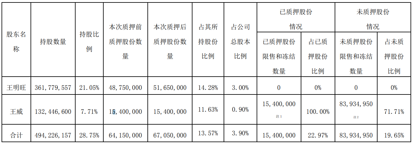 同時(shí),公告顯示,控股股東王明旺補(bǔ)充質(zhì)押股份合計(jì)290萬股。截至2022年4月25日,王明旺及其一致行動(dòng)人累計(jì)質(zhì)押股份數(shù)6705萬股,占其所持股份比例的13.57%,占公司總股本的3.9%。