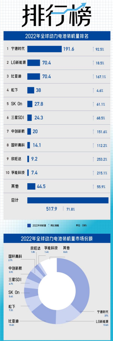 2022年,寧德時代以191.6GWh的壓倒性優(yōu)勢一騎絕塵,獨占市場37%的份額。