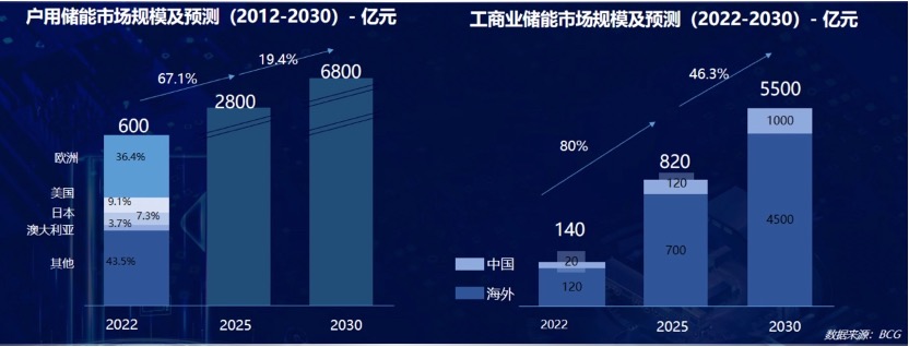 根據(jù)波士頓咨詢公司的測(cè)算,2030年全球戶儲(chǔ)市場(chǎng)規(guī)模達(dá)到6800億元;主要市場(chǎng)在歐美日澳等國(guó),尤其是非洲等弱電網(wǎng)地區(qū)對(duì)戶儲(chǔ)的需求增長(zhǎng)迅速。工商業(yè)儲(chǔ)能主要滿足工商業(yè)場(chǎng)景的儲(chǔ)能需求,預(yù)計(jì)2030年市場(chǎng)規(guī)模達(dá)到5500億元,并進(jìn)入存量替換階段。