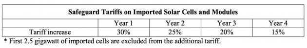 美國(guó)政府表示,關(guān)稅建立在一個(gè)逐年下降的規(guī)模上。在第一年,他們將對(duì)進(jìn)口太陽能組件和電池的最多征收30%的關(guān)稅,隨后每年將下降5%,直到第四年達(dá)到15%。前2.5千兆瓦的進(jìn)口電池被排除在關(guān)稅之外。