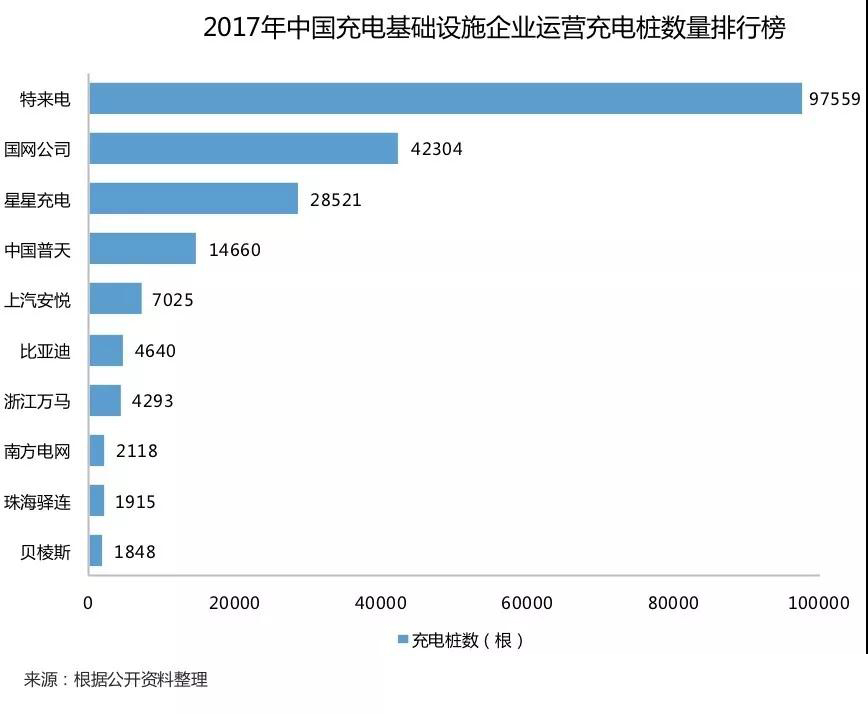 截至2018年5月,有四家企業(yè)完成了過(guò)萬(wàn)的布局,它們?cè)诔潆姺⻊?wù)方面一直在積極探索,已經(jīng)在這個(gè)領(lǐng)域深耕多年。排在第一位的是特來(lái)電,布局了97559根充電樁,第二名為國(guó)網(wǎng)公司,布局了42304根充電樁,第三名為星星充電,布局了28521根充電樁,第四名為中國(guó)普天,布局了14660根充電樁。
