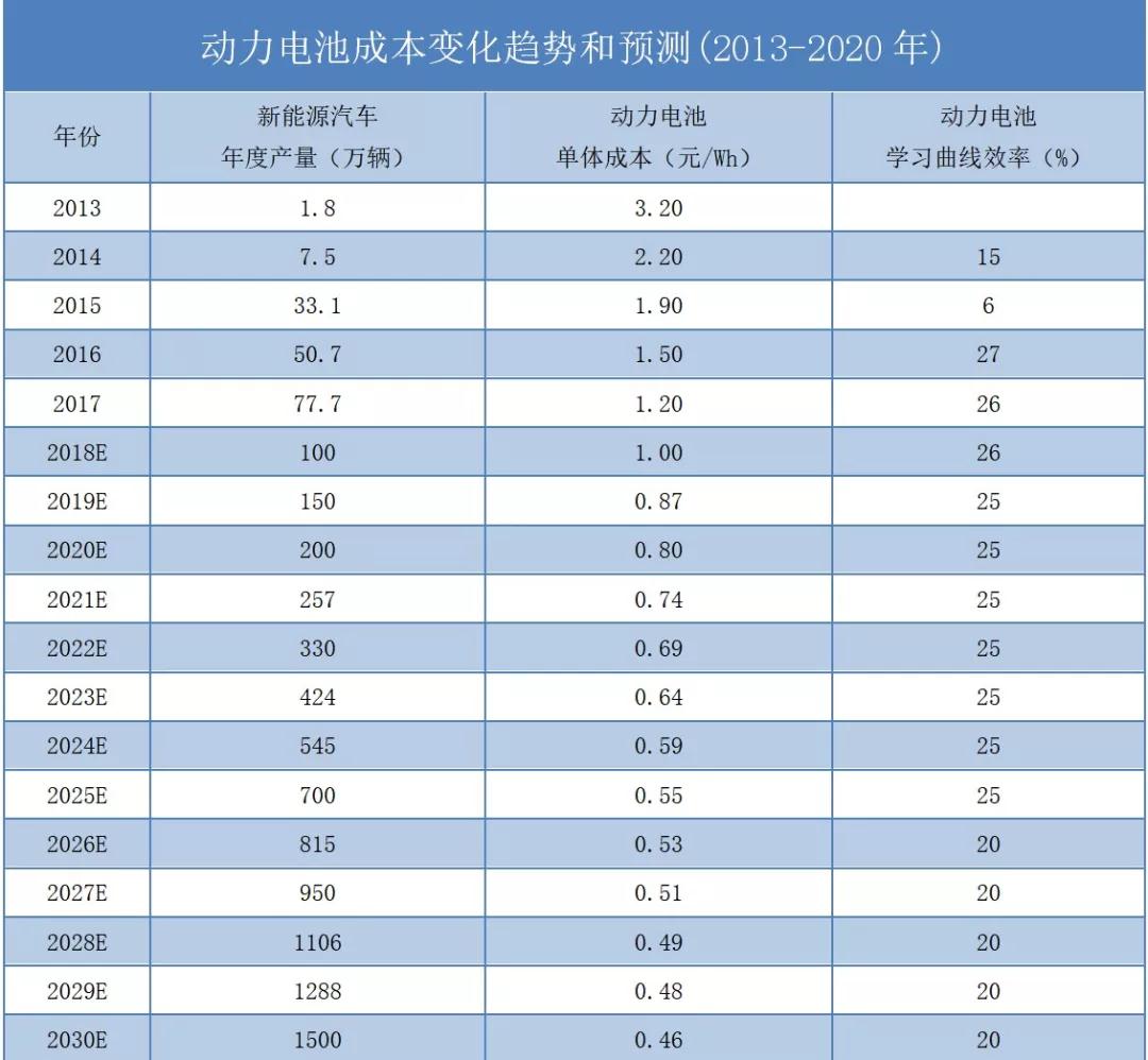 技術(shù)進步對于成本下降的作用也十分明顯。動力電池產(chǎn)業(yè)近年來學(xué)習(xí)效率為25%-20%,因此,預(yù)計2020年、2027年內(nèi)和2030年動力電池成本將分別降至0.8元/Wh、0.51元/Wh和0.46元/Wh。